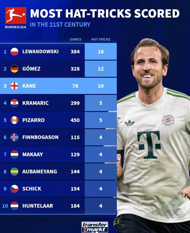 本世纪德甲戴帽数前10:莱万384场16次第1,凯恩76场10次第3